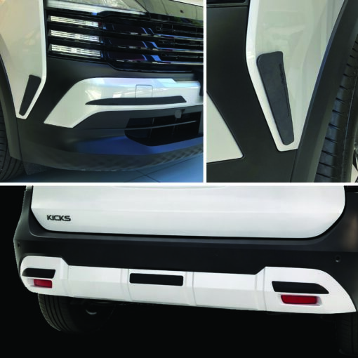 PRODUCTO: • SET COMPUESTO DE LOS PROTECTORES AUTOADHESIVOS NECESARIOS -SEGÚN FOTOS- PARA LA PROTECCIÓN DE PARAGOLPES FRONTAL Y TRASERO DISEÑADOS EN FORMA EXCLUSIVA JUNTO CON CONCESIONARIO OFICIAL PARA NISSAN NEW KICKS (Versión SX7).